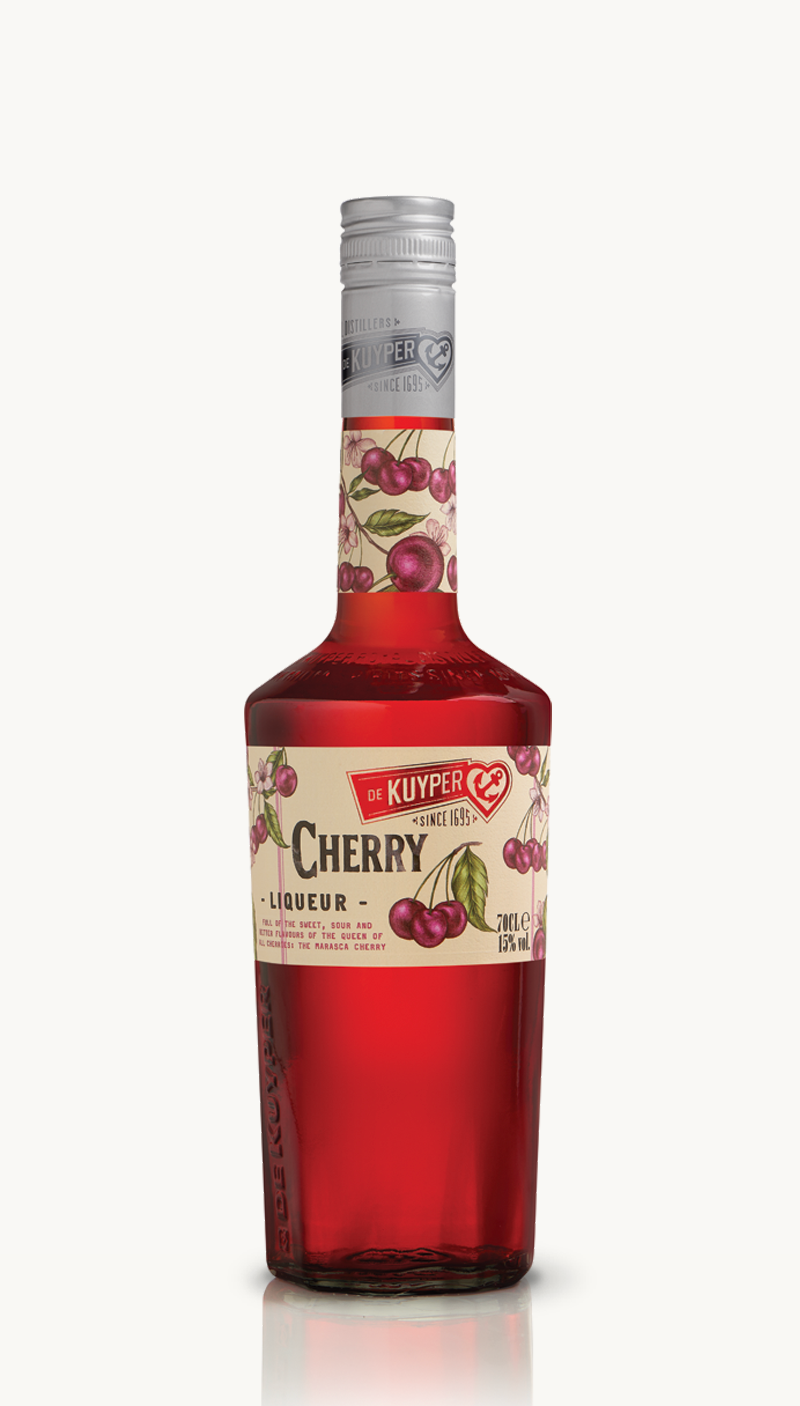 De Kuyper Cherry – based liqueur brandy and dark cherry red extracts obtained by crushing cherry pits.