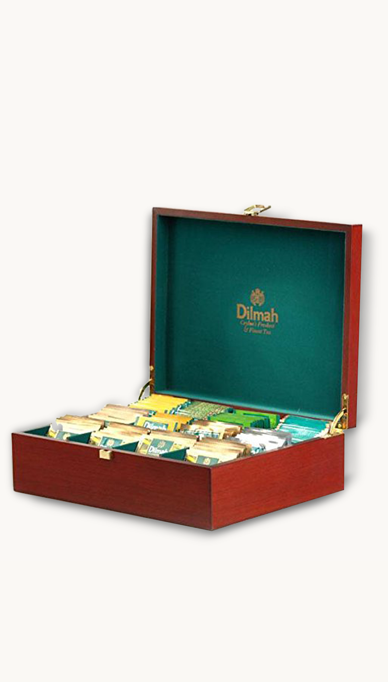 Includes dilmah Gourmet tea wood presenter 12 slots, size 30.5 x 23.5 x 9.1 cm Inside: Dilmah t tea bags 6 tea bags per type total 72 tea bags